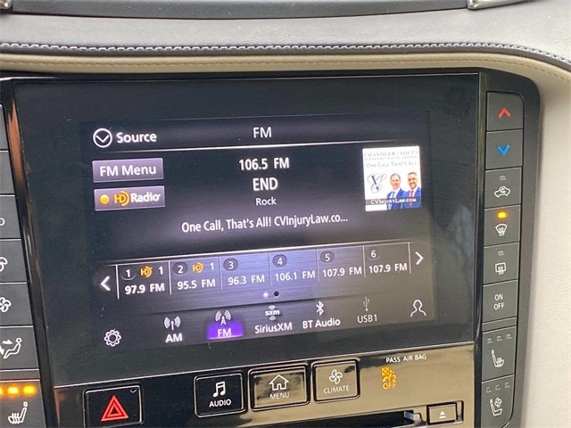 - Radio: Bose Performance Series Premium Audio -inc: 16 speakers, metallic speaker grilles on tweeters, 4 USBs, INFINITI InTouch dual display system w/upper 8" and lower 7" HD touch screens, wireless Apple CarPlay and Android Auto, HD Radio technology, SiriusXM radio w/advanced audio features and 90-day complimentary trial, INFINITI voice recognition, INFINITI InTouch services, Siri eyes free, WiFi hotspot, Bluetooth® hands-free phone and audio streaming, active noise cancellation, navigation w/3D building graphics including 5-year complimentary access to premium traffic and MapCare, SiriusXM Traffic w/3 month complimentary trial access to real-time traffic information and SiriusXM Travel Link w/3 month complimentary trial access to weather, fuel prices, stock prices, sport scores, movie listings and parking